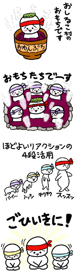 おしるこ村のおみやげは、ほどよいリアクションのスタンプ(2種)と、 今日は何の日か教えてくれるツイッターだよ。おしるこの日もあるかなぁ?- LINEスタンプ: おしるこ村のおもちたち